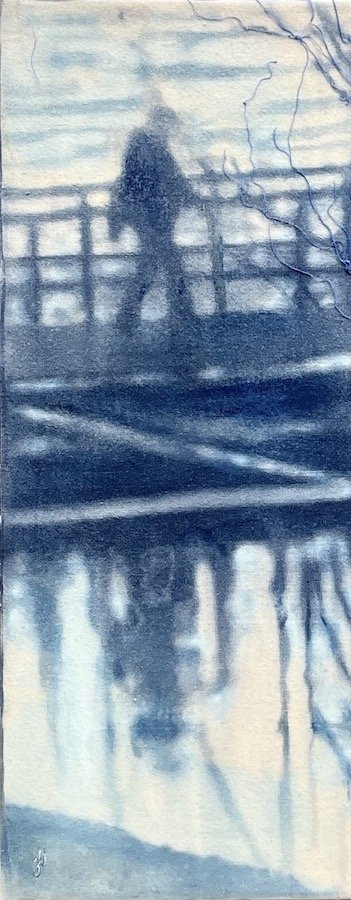 Disrupted Commute ink, oil, cyanotype on canvas 30x40cm framed